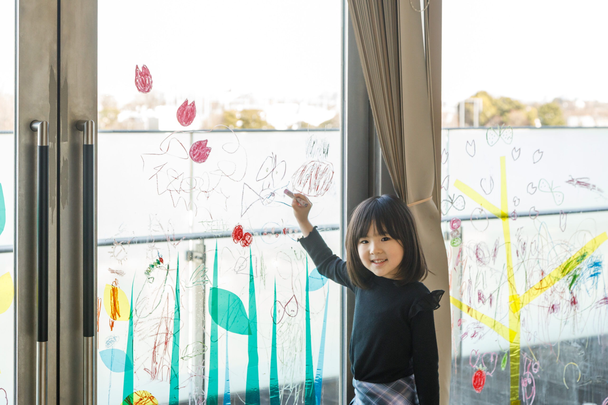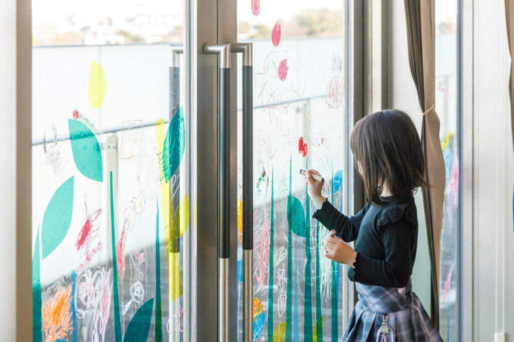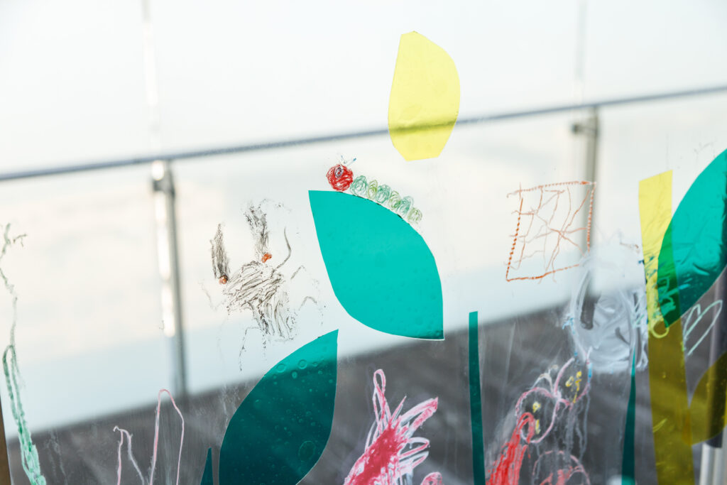 大きな窓をキャンバスに、思い思いに葉っぱや花、生きものを描き、パークを春色に彩りましょう!