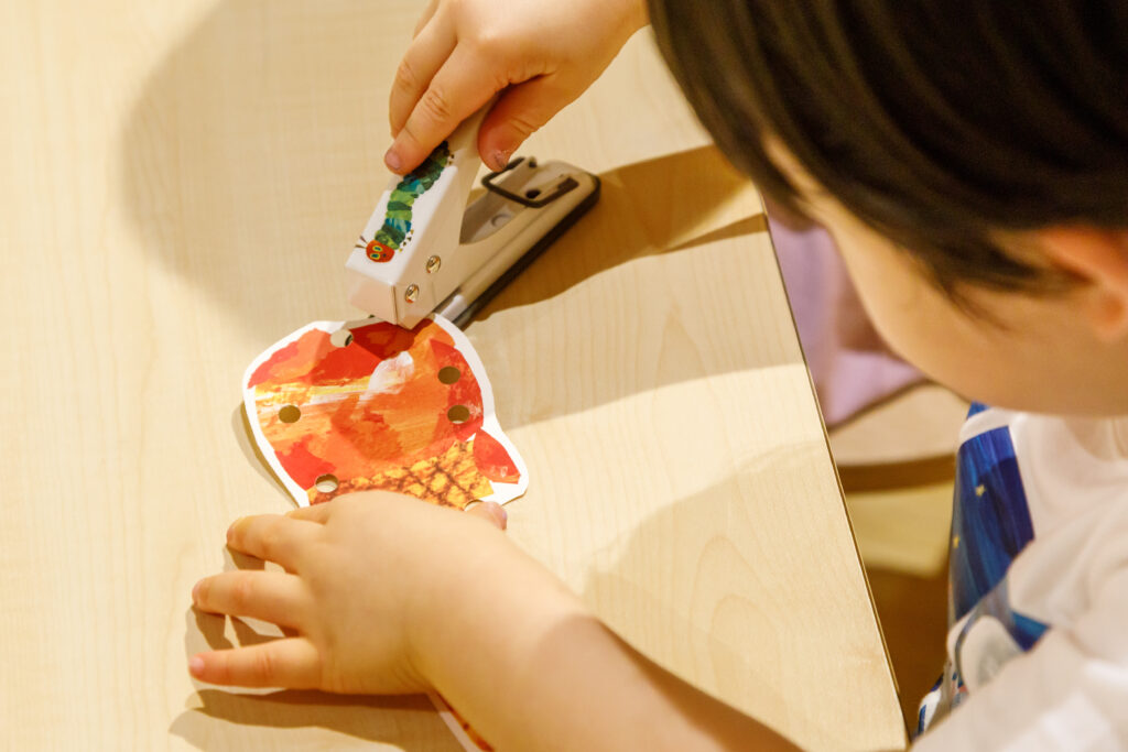 『はらぺこあおむし』の絵本を元に、はらぺこあおむしが食べた、チョコレートケーキ・アイスクリーム・チーズなど、6つの食べ物に穴あけパンチで”穴”を開けてあそびます。