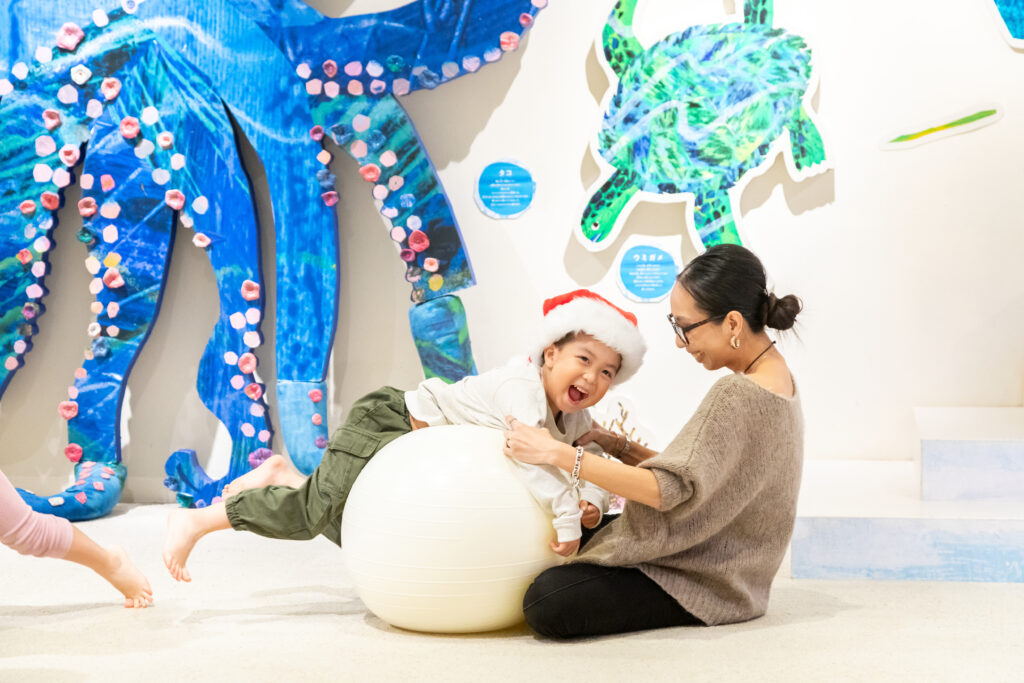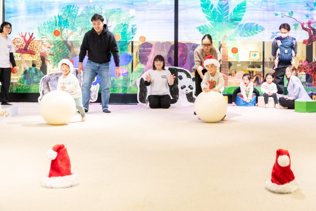 親子で力をあわせてボールを転がしたり、ボールの上でポーズをとってみたり! 寒い冬に負けず、たくさん体を動かしましょう!