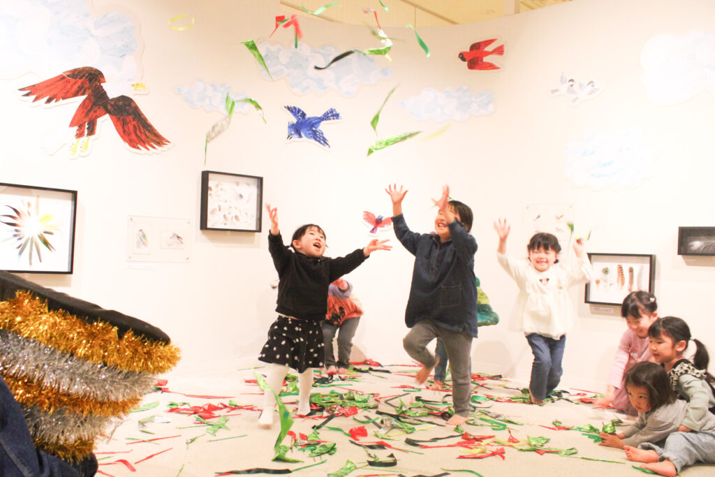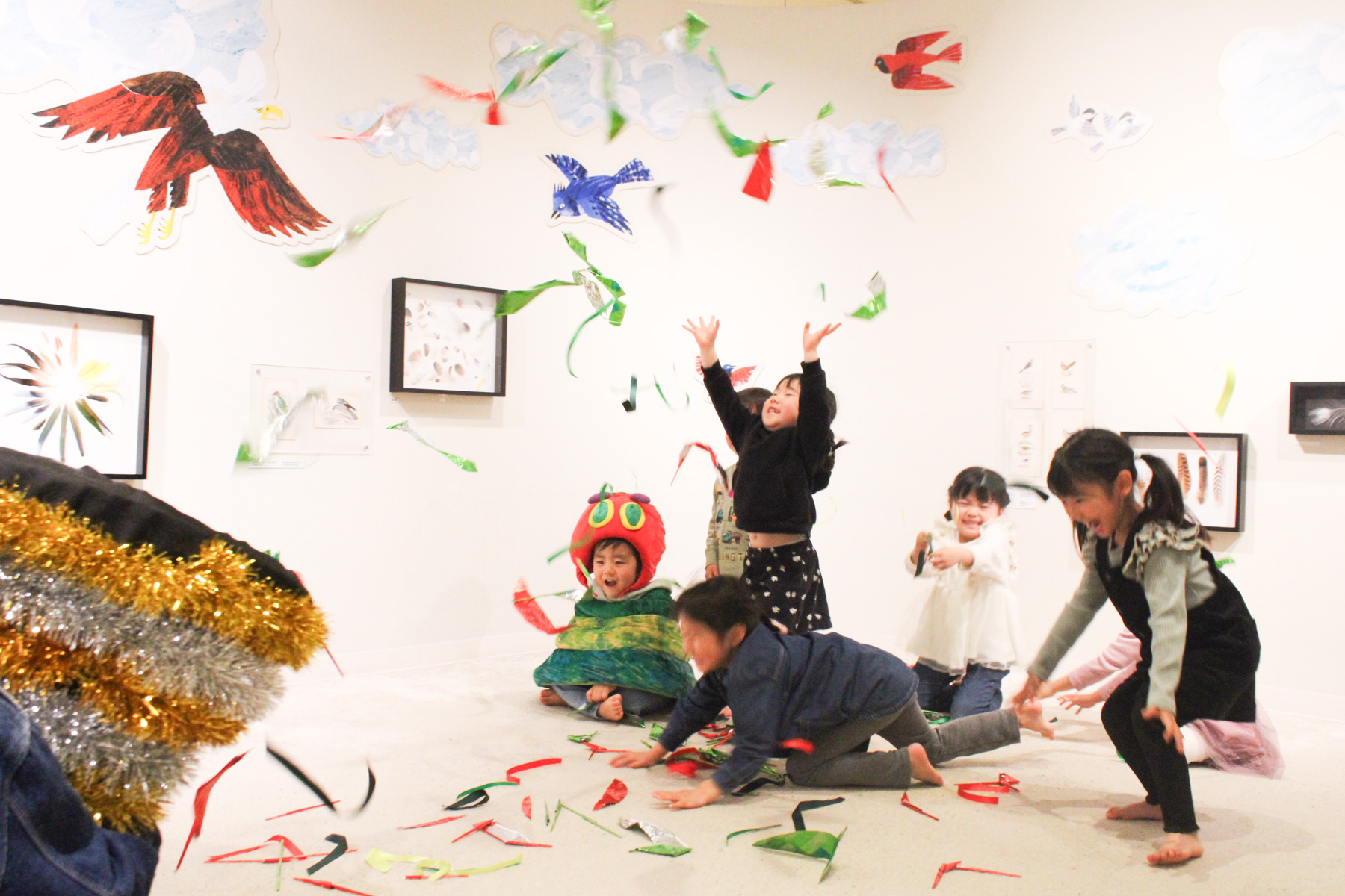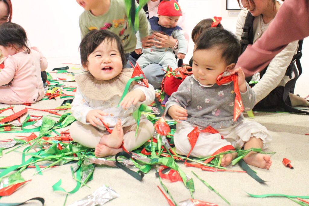 クラッカーから次々と飛びだすキラキラリボンをキャッチしたり、埋もれてみたり。