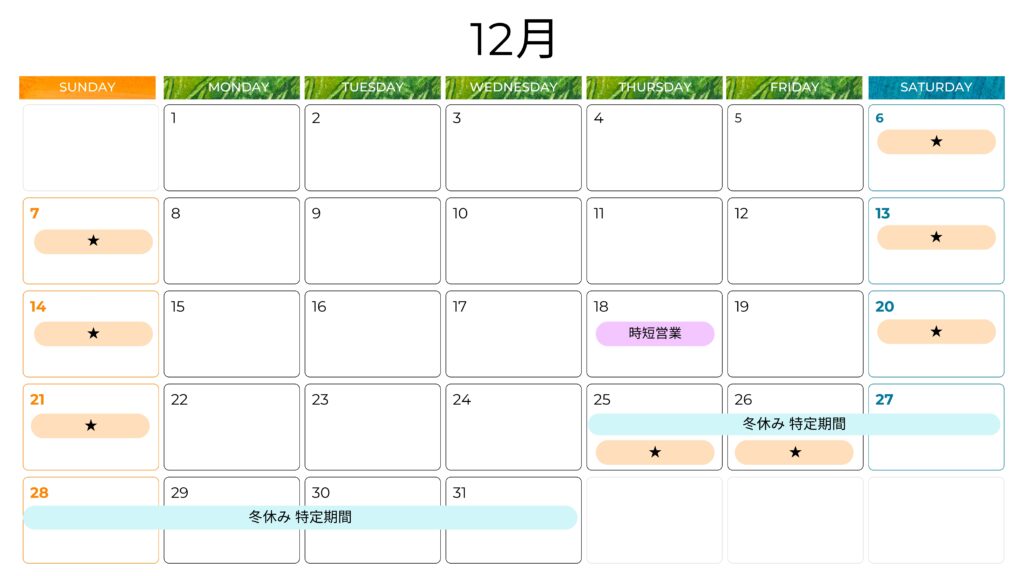 詳細の営業スケジュールについては、下記カレンダーをご確認ください。