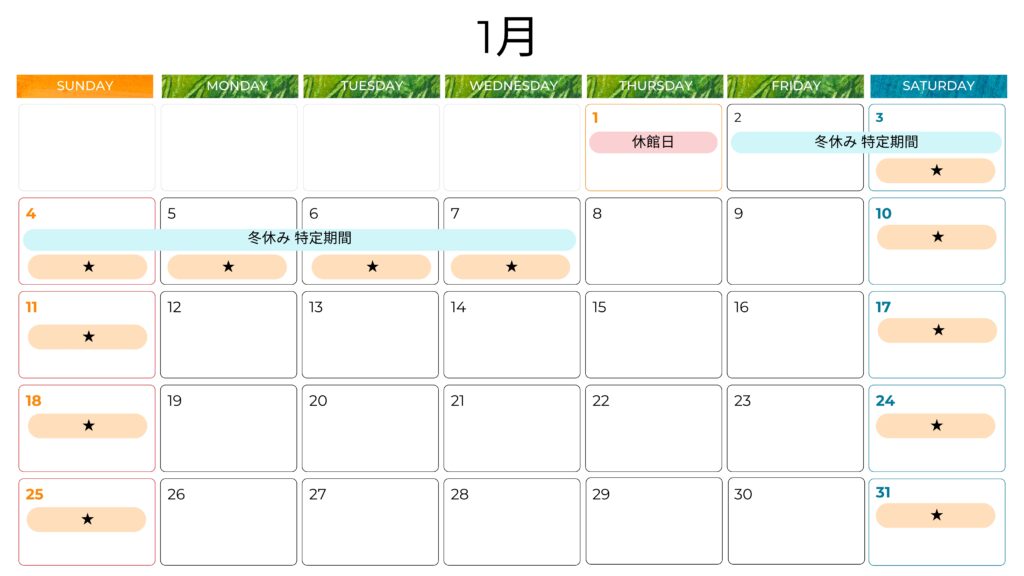 ※「冬休み 特定期間」は、平日も休日と同様の営業となります。3部入替制となり、休日料金でのご案内となります。