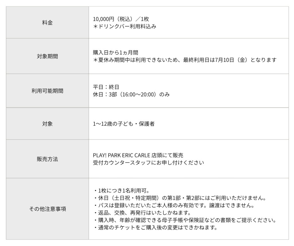 エリック・カールの世界を日常的に、もっとたっぷり楽しみたいという皆様へ向けて、リピーター様向けの新チケット「PREMIUM PASS」を4月28日(火)から販売いたします!購入日から1か月間、対象の時間帯が遊び放題になる、お得なチケットです。
